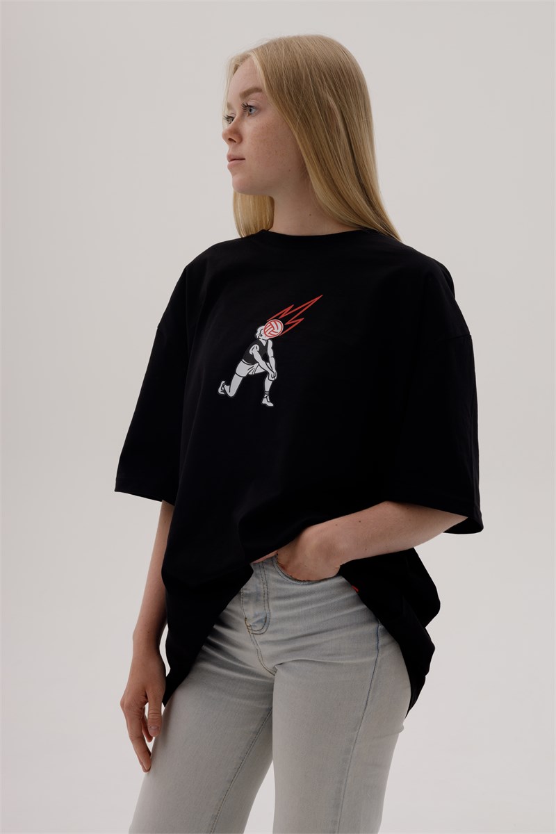 Эта футболка — часть коллекции мемных принтов «Стиль Игры», в которых каждый волейболист узнает себя. На изображении — игрок в падении, тянущийся за мячом, но не дотянувшийся буквально на долю секунды.